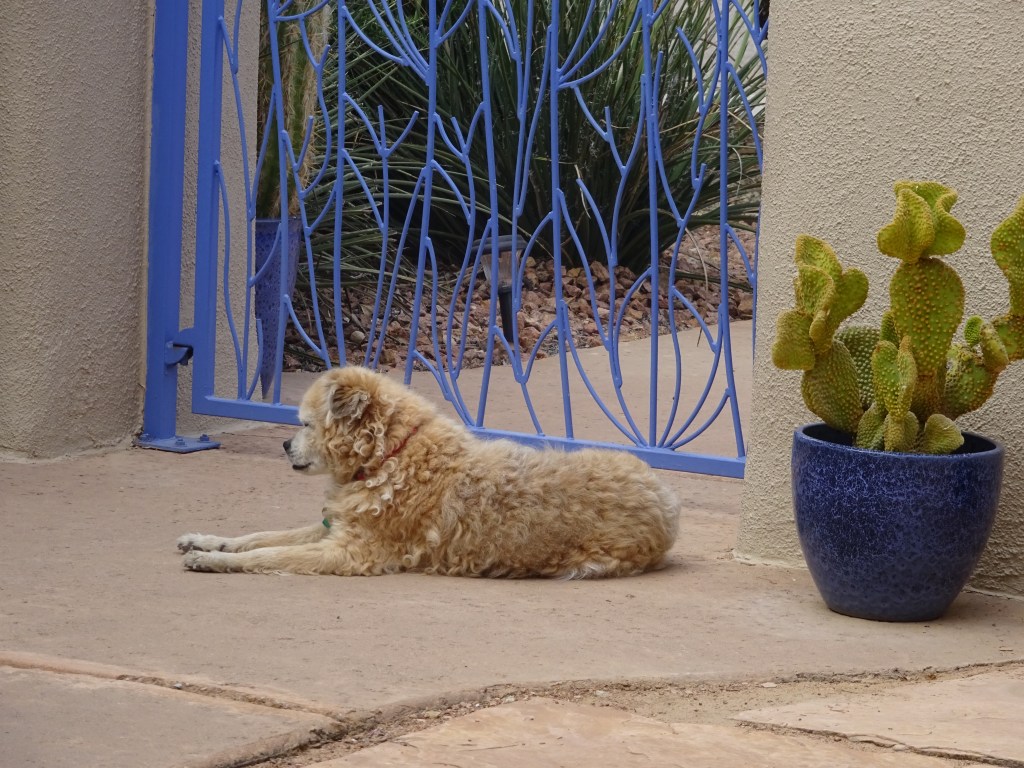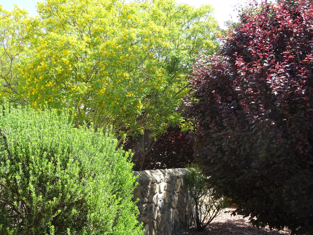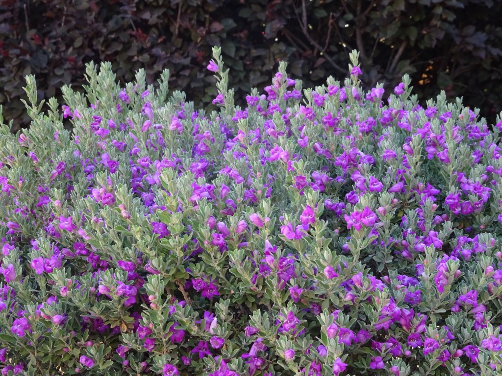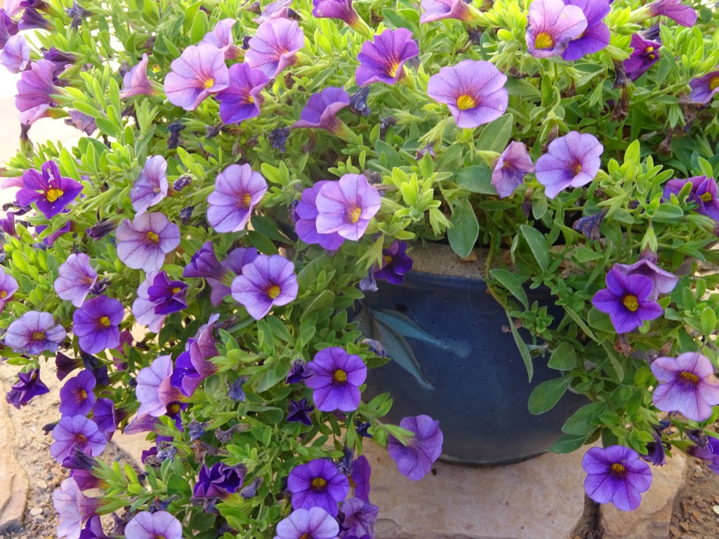 The potted Calibrachoa compete for the spotlight. Elsewhere in the garden, the Purple Cloud bushes are in bloom. Later in summer, after the monsoon rains, their display will be even more spectacular.