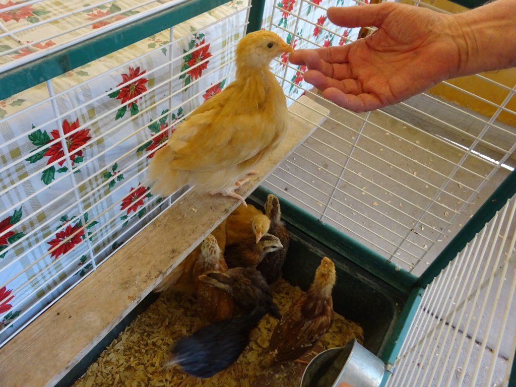 Today, I had my monthly meeting with my spiritual director. I needed this, Gentle Reader, more than you know. After our session, I asked Fr. Valentine if I could see his chickens. First, he showed me the babies. The blurry charcoal gray one (above – center bottom) hatched from his adult chickens. The rest came from the local feed store.