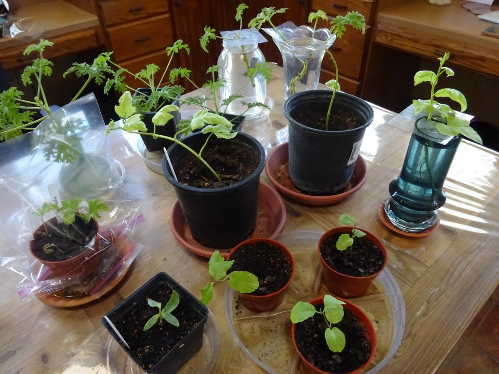 A few days ago in my post “Survivors,” I wrote about my cuttings that survived the winter. I was particularly fond of the Tall Sedum (pictured bottom left). Its four leaves reminded me of a propeller that was just waiting to be launched into spring. Imagine my dismay yesterday, when three of the leaves fell off, and the remaining one turned yellow. I was about to pull the cutting with a sigh, when I noticed new life growing at the base of the stem.