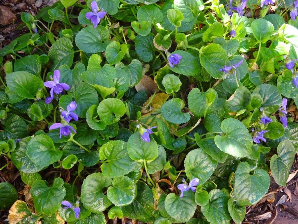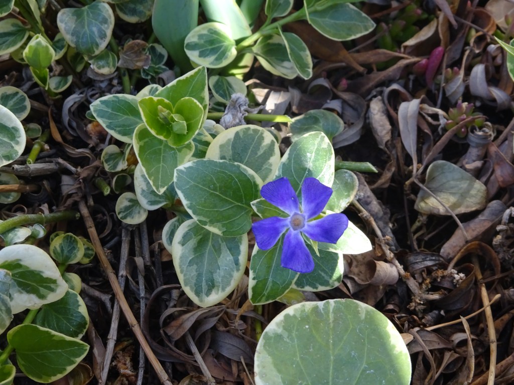Out in the courtyard, the first, unexpected blossom has appeared. And the violets are in bloom!