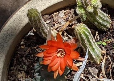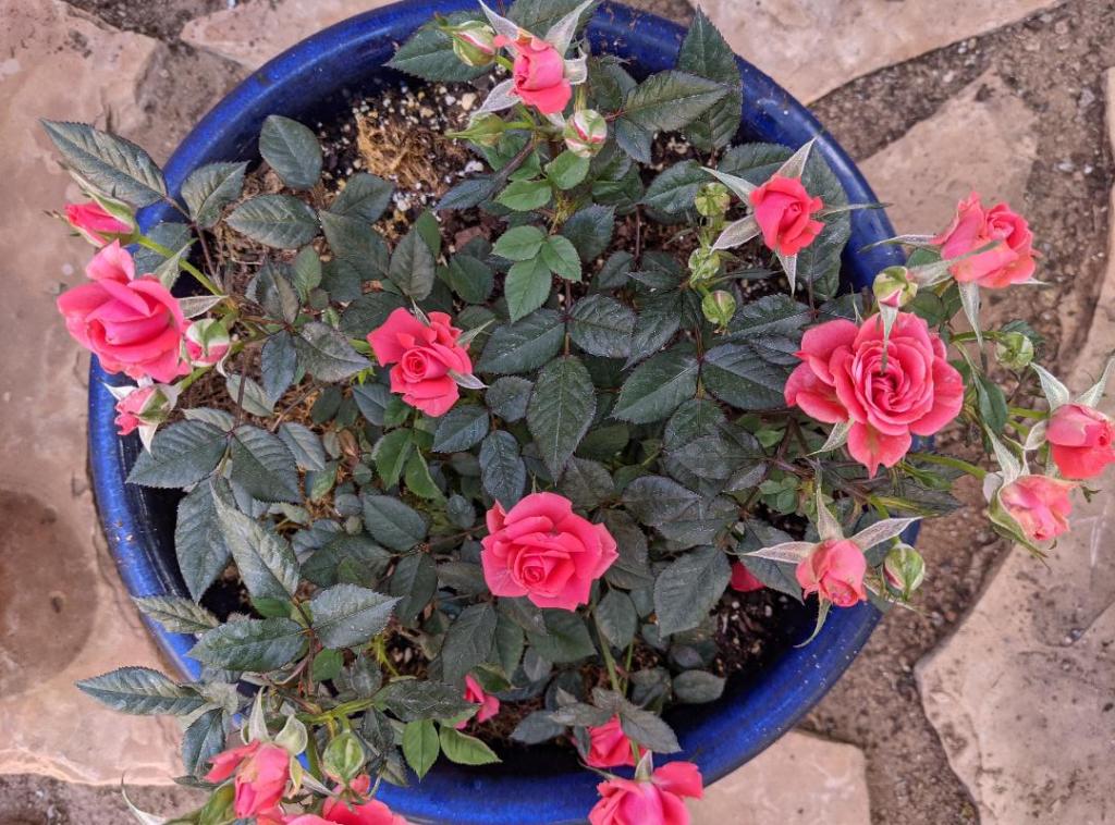 I spent the week in the mountains. It was very dry, so I didn’t see many wildflowers. Before I left for the mountains, my new rose bush (bred specifically for growing in a pot) was covered with buds. When I returned, I found it in full bloom. Roses always make me think of Our Lady.
