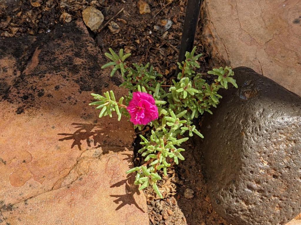Growing conditions are difficult in Southern New Mexico, so I am always charmed and delighted when a volunteer plant shows up in our garden. This year several rock rose volunteers have appeared in the courtyard, and living up to their name, they have chosen the most rocky and difficult locations in which to appear. All are descendants from the one pot of rock roses that I planted last year.