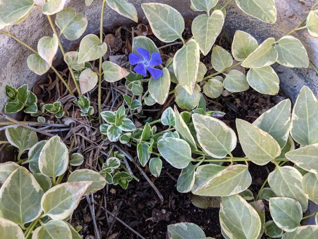 Even though the temperature is still dancing around 32ᵒ F in the night, the days are warming up. The first blossom has opened on my variegated vinca (Periwinkle), along with some healthy new shoots that will make good cuttings for future plants.