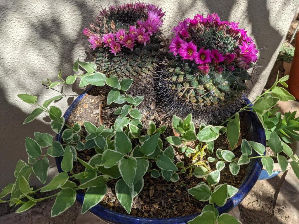 The Vinca (Periwinkle) vines are bursting with new life. I started the plants last summer as small cuttings from another pot. All of my other pots were occupied at the time, so I stuck the tender shoots into the pot with the cacti. I wondered how they would get along.