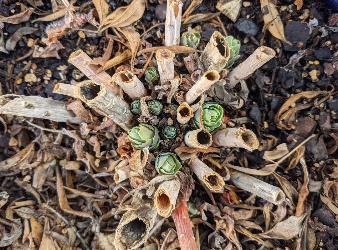 A few violets have appeared. Soon there will be a purple carpet of the little dears. And new shoots of tall sedum have appeared among the dead stalks of last year’s offering. They remind me of miniature cabbages.