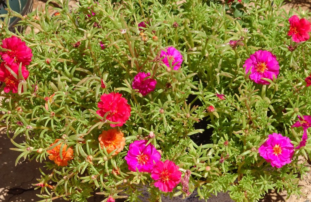 In our courtyard, the moss roses are in bloom for reasons of their own. They have no thought of their loveliness to my gaze — how the variety of their colors delights me.