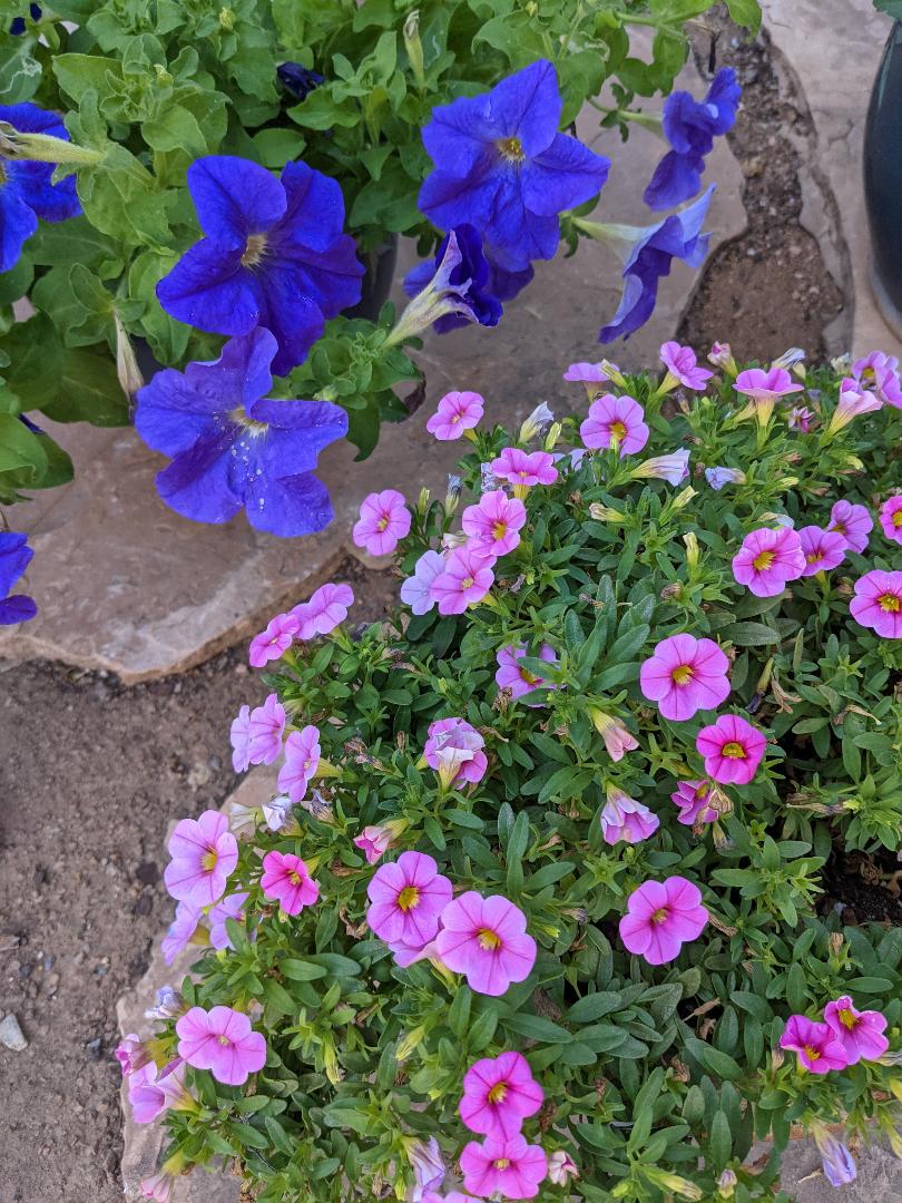Sometimes the most interesting floral combinations seem to occur by happenstance. When I came home from the mountains this week, one of my cacti was in full bloom. I was lucky to see it, since the blossoms only last for one day. In the background — Calibrachoa, Petunias with Lobelia, and Dianthus.